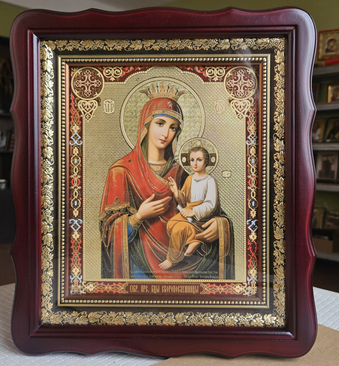 Ікона Пресвята Богородиця Скоропослушниця у темному фігурному кіоті під склом, розмір кіота 32×28, сюжет 20×24.