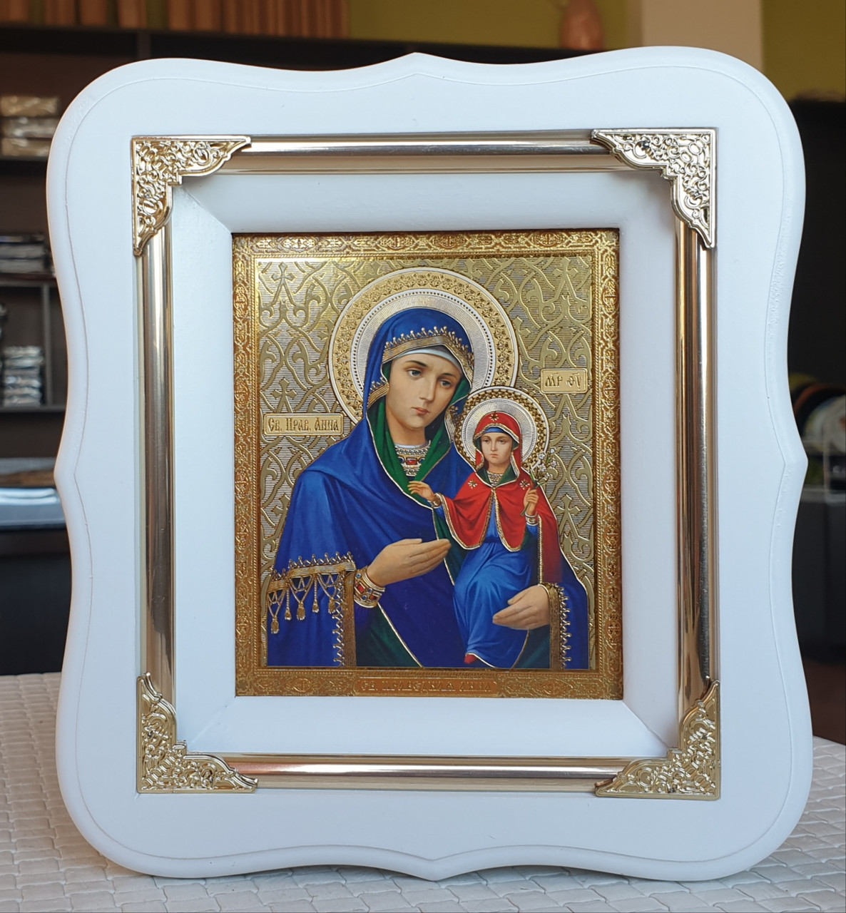 Ікона свята праведна Анна в білому фігурному кіоті під склом , розмір кіота 18*16, сюжет 10*12