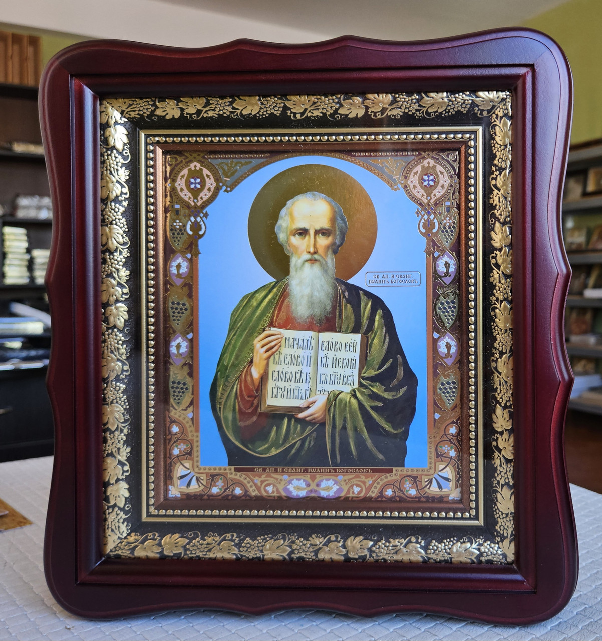 Ікона Святий Іоан Богослов в темному фігурному дерев'яному кіоті під склом,розмір кіота 26*23,сюжет 15*18